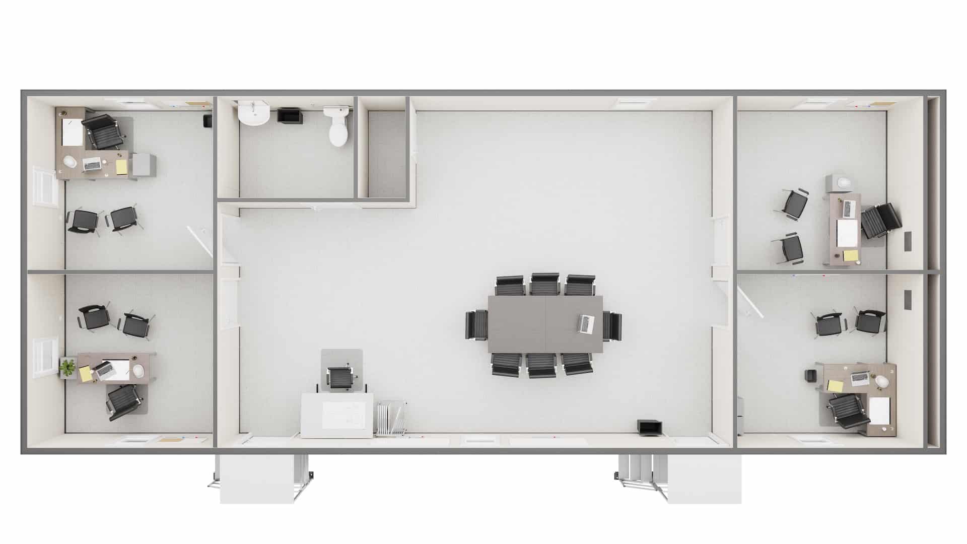 The 24′ x 64′ office trailer is the largest size in our fleet and is designed for those who need maximum space. The double-wide modular building deploys quickly and is the ultimate in flexibility. This model is often configured to accommodate four 144-square-foot office spaces, a large common work area, and one restroom. A flexible floor plan can be customized to meet a variety of needs. Contact us for mobile office rental prices based on your lease term.